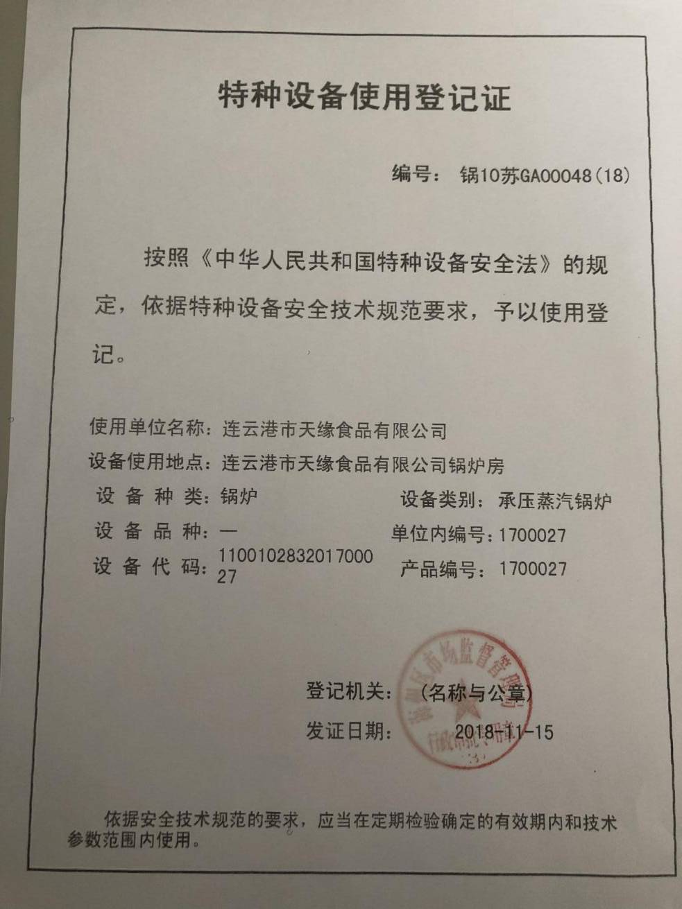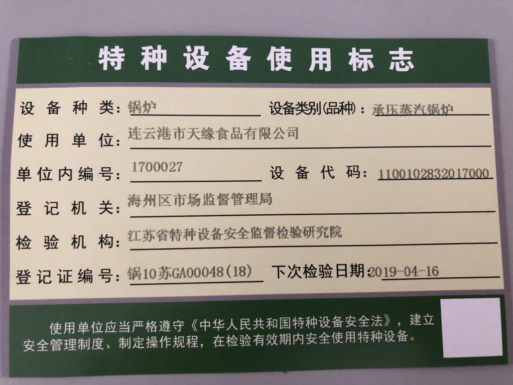 按照政府環保部門相關要求,為減少污染,消除燃煤鍋爐在運行過程中存在的安全隱患,天緣食品上半年積極聯系燃氣公司,拆除燃煤鍋爐,更換符合國家要求的燃氣鍋爐,同時安裝太陽能,以確保公司生產正常運營。下半年,根據要求,工作人員又主動到市場監督管理局將原鍋爐使用登記證注銷,并成功辦理新鍋爐的使用登記證。