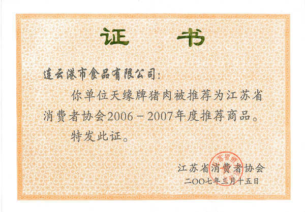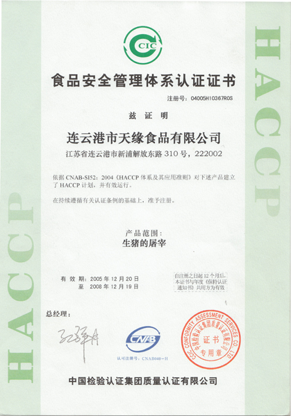 經(jīng)過多年的努力,公司先后取得了一定的成績。公司是政府“菜籃子”工程主要的肉類加工供應(yīng)商,是國家儲(chǔ)備肉定點(diǎn)廠和商品豬活體儲(chǔ)備基地,通過了省無公害農(nóng)產(chǎn)品認(rèn)定和無公害畜禽產(chǎn)地認(rèn)定;豬肉及肉制品的生產(chǎn)過程也先后通過了GB/T22000、QS體系認(rèn)證;“天緣”品牌先后多次被認(rèn)定為連云港市知名商標(biāo)、江蘇省著名商標(biāo);產(chǎn)品被評(píng)為江蘇省名牌農(nóng)產(chǎn)品、連云港市名牌產(chǎn)品、連續(xù)多屆被省消協(xié)評(píng)為放心食品、推薦商品;企業(yè)先后被評(píng)為市農(nóng)業(yè)產(chǎn)業(yè)化龍頭企業(yè)、信用管理示范企業(yè)、服務(wù)滿意單位、質(zhì)量管理先進(jìn)單位、連云港市優(yōu)秀民營企業(yè)、世界肉類大會(huì)優(yōu)秀參展商。多年來為政府“菜籃子”工程、保障食品安全和帶動(dòng)廣大農(nóng)民致富作出了突出貢獻(xiàn)。